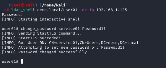 As demonstrated below, I leveraged the ldap_shell to initiate a shell on the domain controller over the LDAP protocol as demo\user01. Then abused our allotted permissions to reset the password of demo\service01 via the change_password command: