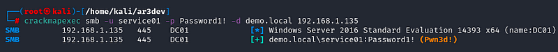 These changes were confirmed with CrackMapExec to validate administrator privileges on the demo.local domain!