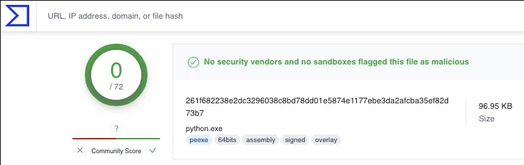 Additionally, python.exe is a signed binary with a high reputation score, making it unlikely to be blocked. This provides a perfect vehicle for execution of a C2 beacon, or other payload, while on offensive security engagements.