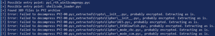 The first step in decompiling the shellcode_loader.exe file is to unpack the compiled binary using pyinstxtractor. This will create a new directory containing the original Python bytecode files and packaged resources: